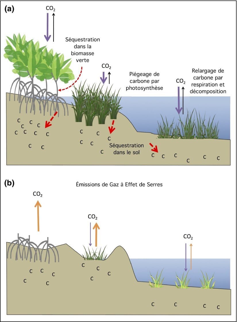 (b) La dégradation de ces habitats favorise l’émission de carbone.